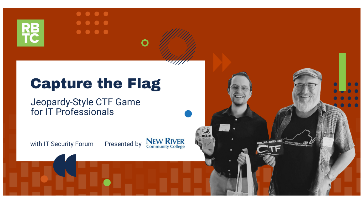 New River Community College S.T.E.M. Campus 782 New River Road Northwest, Christiansburg, Virginia, United StatesIT-Security Professionals Capture the Flag! This year, the RBTC IT-Security Forum CTF is on Tuesday, March 31st, after work from 5:30 - 9pm! Are you ready to hack?!? Whether you're a gray-beard IT-Professional, a read-team Cyber Pentester, or a green IT-Security n00b — if you love hands on IT-Security, then this Capture the Flag […]